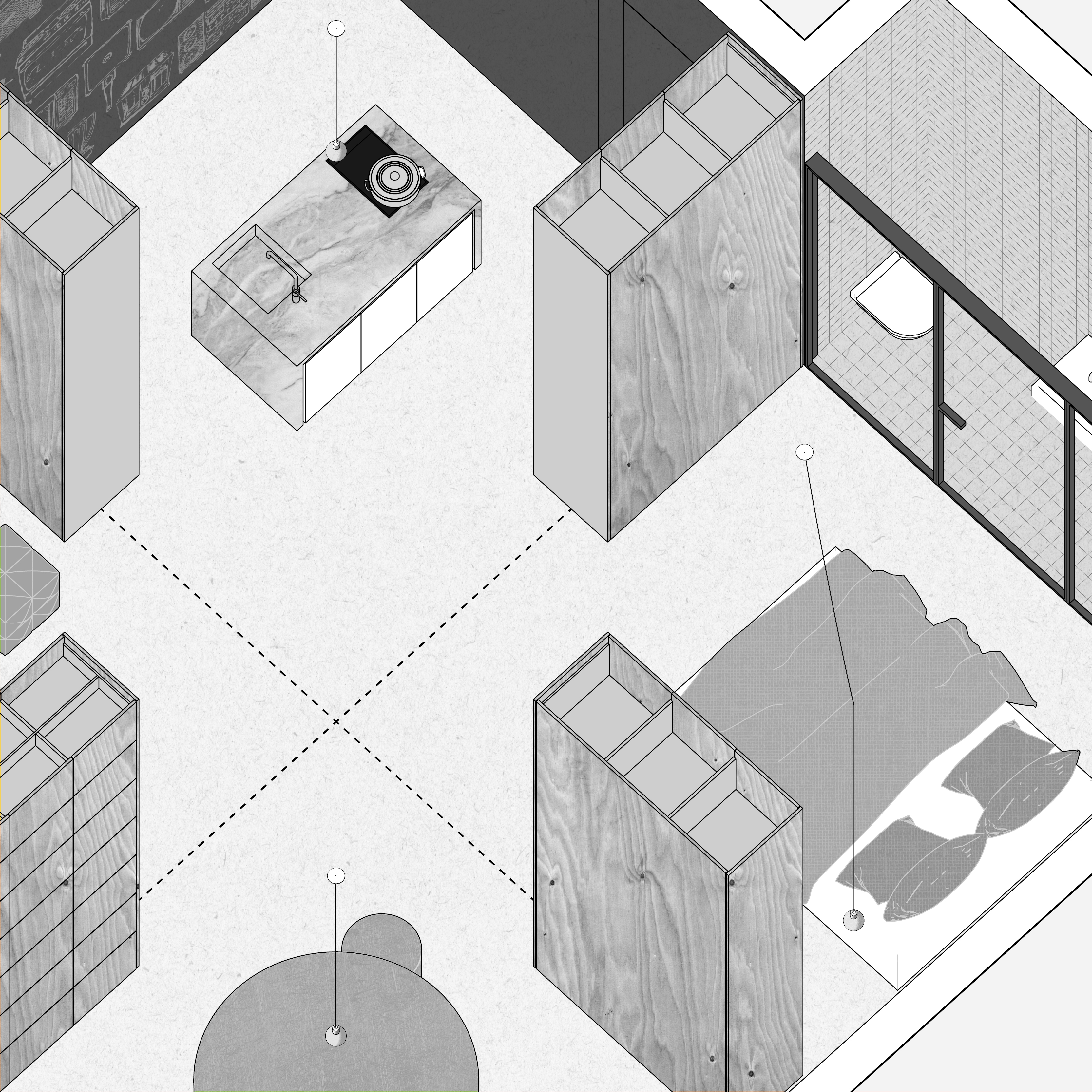 Eeuwenlang is het ruimtelijk ordenend element van woonvertrekken in de woning de en-suite geweest. De steeds kleiner wordende woonruimte vraagt om een her-interpretatie van deze en-suite. Niet de schuifdeuren maar de kasten zelf geven vorm aan de ruimte en de verschillende functies van de woning.