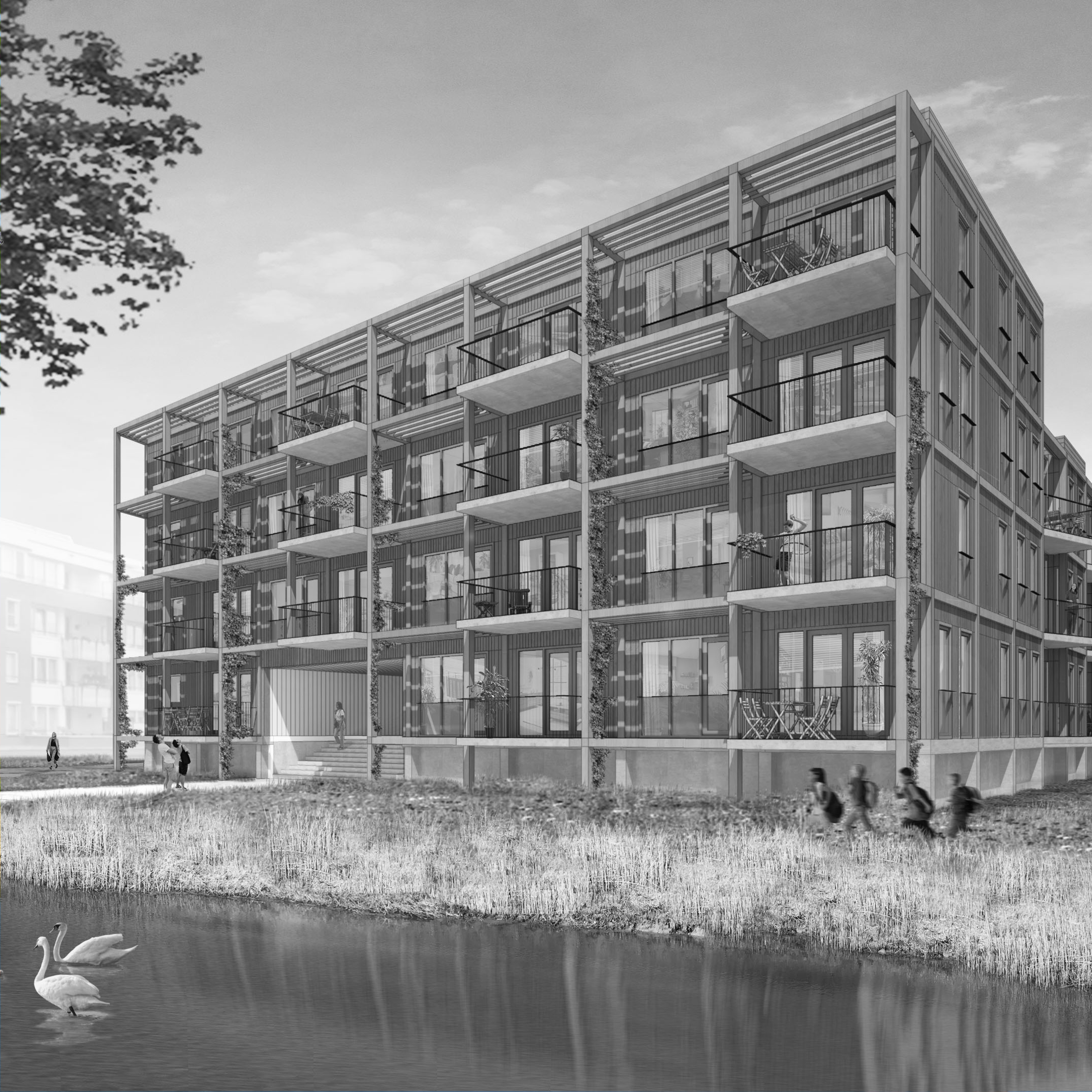 Vijf stoere gebouwclusters gelegen in een sterk samenhangend, gastvrij landschap. Een landschap dat vooral bestaat uit water, riet en brede houten vlonders. Een uitgesproken natuurlijke sfeer en een optimale klimaatbestendige inrichting. Een hoog kwalitatieve leefomgeving met optimale inzet voor biodiversiteit.